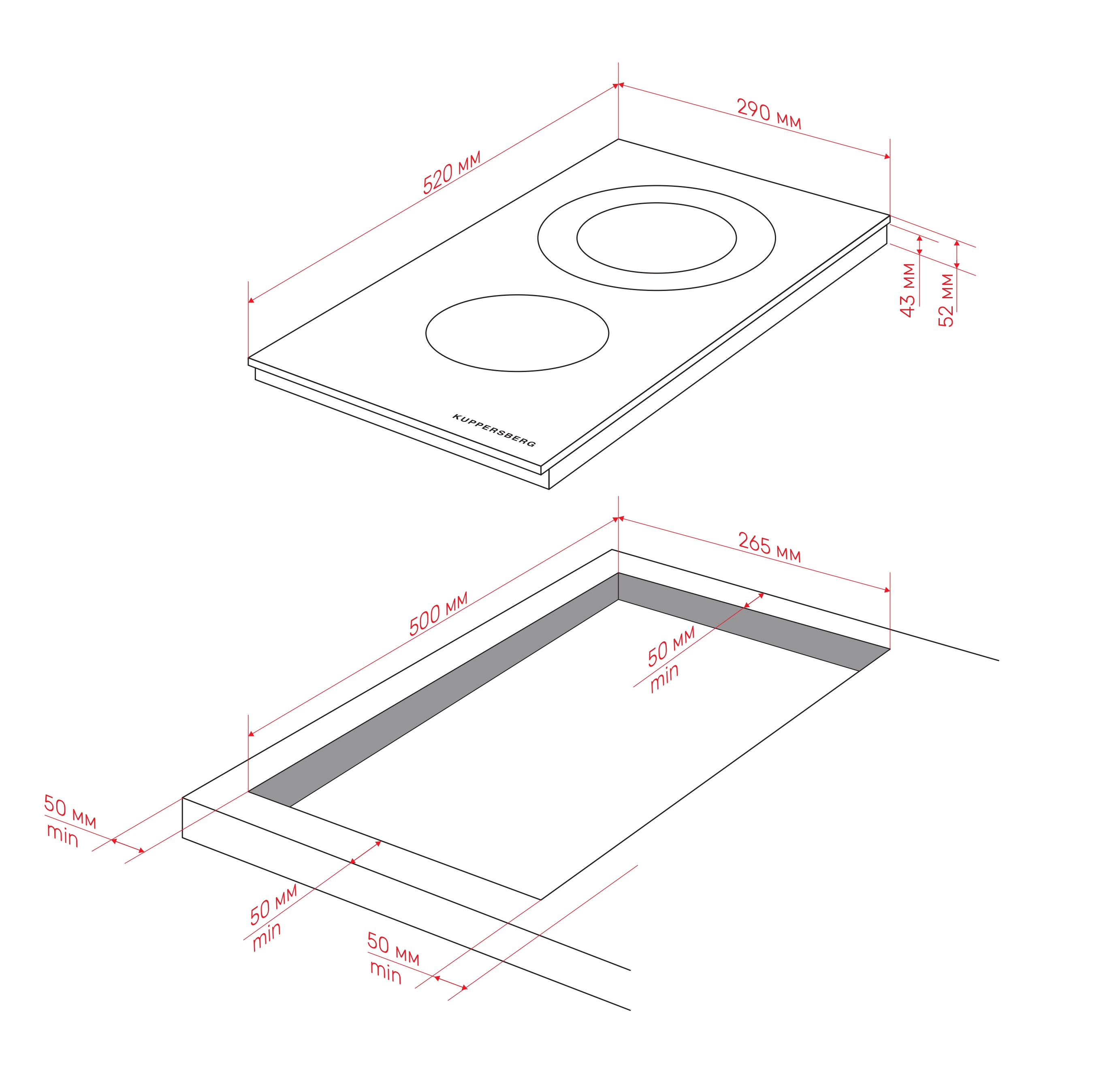 - Recess size for embedding (WxD), mm 265x500